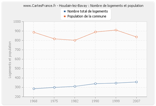 La population de Houdain-lez-Bavay était de 837 habitants en 2007, 911 habitants en 1999, 890 habitants en 1990, 802 habitants en 1982, 817 habitants en 1975 et 887 habitants en 1968. Parallèlement, le nombre de logements de Houdain-lez-Bavay était de 358 en 2007, 346 en 1999, 340 en 1990, 311 en 1982, 300 en 1975 et 286 en 1968.