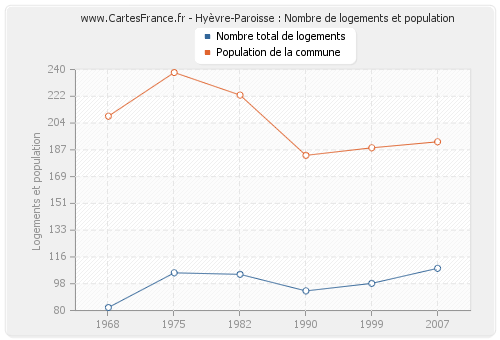 La population de Hyèvre-Paroisse était de 192 habitants en 2007, 188 habitants en 1999, 183 habitants en 1990, 223 habitants en 1982, 238 habitants en 1975 et 209 habitants en 1968. Parallèlement, le nombre de logements de Hyèvre-Paroisse était de 108 en 2007, 98 en 1999, 93 en 1990, 104 en 1982, 105 en 1975 et 82 en 1968.