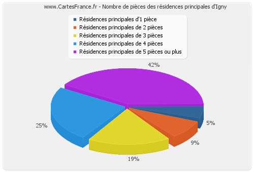La Ville d'Igny recensait la même année un total de 4 032 ménages. Les graphiques suivants présentent les statistiques d'habitation de ces ménages d'Igny.