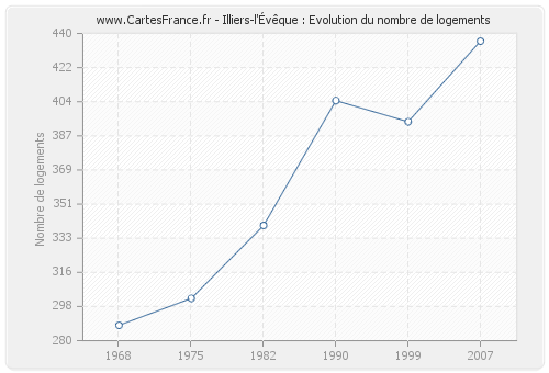 Le nombre de logements d'Illiers-l'Évêque était de 436 en 2007, 394 en 1999, 405 en 1990, 340 en 1982, 302 en 1975 et 288 en 1968.
