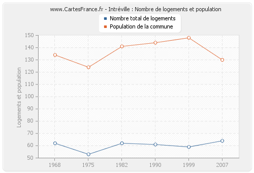 La population d'Intréville était de 130 habitants en 2007, 148 habitants en 1999, 144 habitants en 1990, 141 habitants en 1982, 124 habitants en 1975 et 134 habitants en 1968. Parallèlement, le nombre de logements d'Intréville était de 64 en 2007, 59 en 1999, 61 en 1990, 62 en 1982, 53 en 1975 et 62 en 1968.