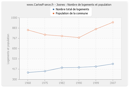 La population de Josnes était de 949 habitants en 2007, 872 habitants en 1999, 775 habitants en 1990, 793 habitants en 1982, 808 habitants en 1975 et 861 habitants en 1968. Parallèlement, le nombre de logements de Josnes était de 477 en 2007, 447 en 1999, 437 en 1990, 434 en 1982, 394 en 1975 et 379 en 1968.