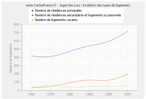 Les graphiques suivant reprennent l'historique du nombre et du type de logements de Jugon-les-Lacs de 1968 à 2007. Le deuxième graphique est tracé en interpolation cubique. Ceci permet d'obtenir plus précisément le nombre de logement du village de Jugon-les-Lacs les années ou aucun recensement n'a été effectué.