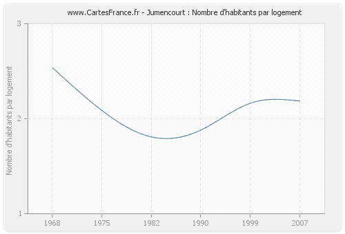 - Nombre d'habitants moyen par logement de Jumencourt en 2007 : 2,19