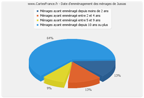 - Nombre de ménages de Jussas ayant emménagé depuis 10 ans ou plus : 29