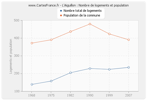 Historique du nombre de logements de L'Aiguillon de 1968 à 2007 :