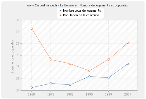 La population de La Boissière était de 64 habitants en 2007, 52 habitants en 1999, 44 habitants en 1990, 49 habitants en 1982, 52 habitants en 1975 et 74 habitants en 1968. Parallèlement, le nombre de logements de La Boissière était de 49 en 2007, 39 en 1999, 40 en 1990, 34 en 1982, 35 en 1975 et 32 en 1968.