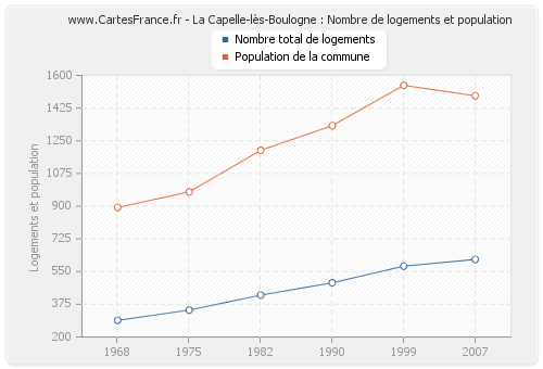 La population de La Capelle-lès-Boulogne était de 1 491 habitants en 2007, 1 547 habitants en 1999, 1 331 habitants en 1990, 1 199 habitants en 1982, 977 habitants en 1975 et 893 habitants en 1968. Parallèlement, le nombre de logements de La Capelle-lès-Boulogne était de 615 en 2007, 579 en 1999, 490 en 1990, 424 en 1982, 344 en 1975 et 289 en 1968.