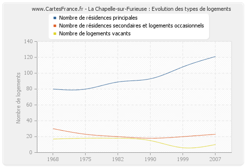 Les graphiques suivant reprennent l'historique du nombre et du type de logements de La Chapelle-sur-Furieuse de 1968 à 2007. Le deuxième graphique est tracé en interpolation cubique. Ceci permet d'obtenir plus précisément le nombre de logement du village de La Chapelle-sur-Furieuse les années ou aucun recensement n'a été effectué.