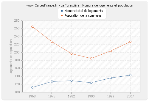 La population de La Forestière était de 227 habitants en 2007, 204 habitants en 1999, 185 habitants en 1990, 197 habitants en 1982, 227 habitants en 1975 et 265 habitants en 1968. Parallèlement, le nombre de logements de La Forestière était de 143 en 2007, 136 en 1999, 124 en 1990, 129 en 1982, 127 en 1975 et 112 en 1968.