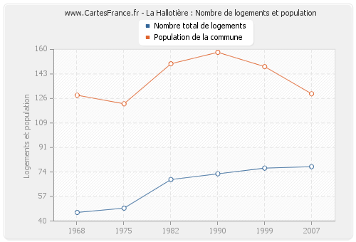 La population de La Hallotière était de 129 habitants en 2007, 148 habitants en 1999, 158 habitants en 1990, 150 habitants en 1982, 122 habitants en 1975 et 128 habitants en 1968. Parallèlement, le nombre de logements de La Hallotière était de 78 en 2007, 77 en 1999, 73 en 1990, 69 en 1982, 49 en 1975 et 46 en 1968.