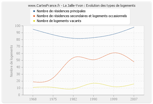 Les graphiques suivant reprennent l'historique du nombre et du type de logements de La Jaille-Yvon de 1968 à 2007. Le deuxième graphique est tracé en interpolation cubique. Ceci permet d'obtenir plus précisément le nombre de logement du village de La Jaille-Yvon les années ou aucun recensement n'a été effectué.