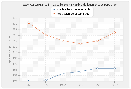La population de La Jaille-Yvon était de 275 habitants en 2007, 248 habitants en 1999, 239 habitants en 1990, 249 habitants en 1982, 267 habitants en 1975 et 306 habitants en 1968. Parallèlement, le nombre de logements de La Jaille-Yvon était de 161 en 2007, 161 en 1999, 151 en 1990, 145 en 1982, 123 en 1975 et 125 en 1968.