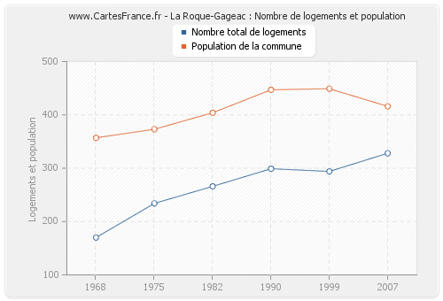 La population de La Roque-Gageac était de 416 habitants en 2007, 449 habitants en 1999, 447 habitants en 1990, 404 habitants en 1982, 373 habitants en 1975 et 357 habitants en 1968. Parallèlement, le nombre de logements de La Roque-Gageac était de 328 en 2007, 294 en 1999, 299 en 1990, 266 en 1982, 234 en 1975 et 170 en 1968.