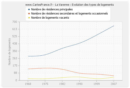 Les graphiques suivant reprennent l'historique du nombre et du type de logements de La Varenne de 1968 à 2007. Le deuxième graphique est tracé en interpolation cubique. Ceci permet d'obtenir plus précisément le nombre de logement du village de La Varenne les années ou aucun recensement n'a été effectué.