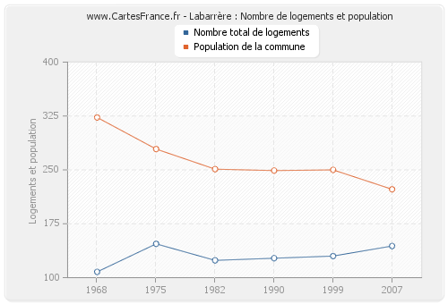 La population de Labarrère était de 223 habitants en 2007, 250 habitants en 1999, 249 habitants en 1990, 251 habitants en 1982, 279 habitants en 1975 et 323 habitants en 1968. Parallèlement, le nombre de logements de Labarrère était de 144 en 2007, 130 en 1999, 127 en 1990, 124 en 1982, 147 en 1975 et 108 en 1968.