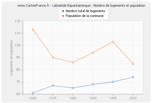 La population de Labastide-Esparbairenque était de 85 habitants en 2007, 103 habitants en 1999, 94 habitants en 1990, 86 habitants en 1982, 90 habitants en 1975 et 113 habitants en 1968. Parallèlement, le nombre de logements de Labastide-Esparbairenque était de 74 en 2007, 70 en 1999, 68 en 1990, 65 en 1982, 67 en 1975 et 61 en 1968.