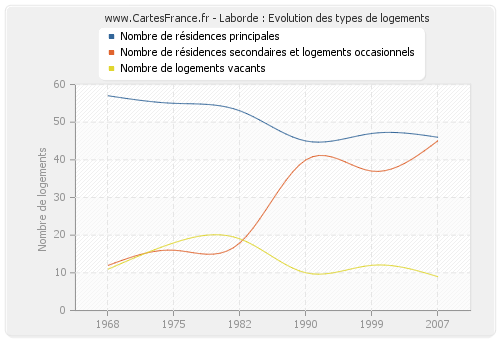 En 2007 les logements de Laborde étaient composés de 46 résidences principales, 45 résidences secondaires ou occasionnels ainsi que 9 logements vacants.