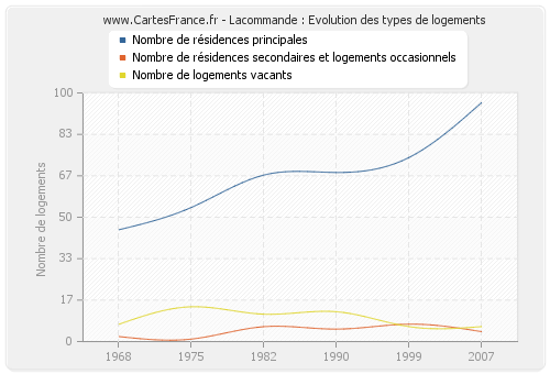 - Nombre de résidences principales de Lacommande en 2007 : 96