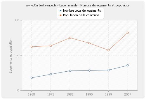 La population de Lacommande était de 247 habitants en 2007, 172 habitants en 1999, 202 habitants en 1990, 225 habitants en 1982, 191 habitants en 1975 et 187 habitants en 1968. Parallèlement, le nombre de logements de Lacommande était de 107 en 2007, 87 en 1999, 85 en 1990, 84 en 1982, 69 en 1975 et 54 en 1968.