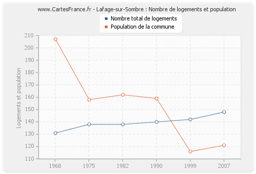 La population de Lafage-sur-Sombre était de 121 habitants en 2007, 116 habitants en 1999, 159 habitants en 1990, 162 habitants en 1982, 158 habitants en 1975 et 207 habitants en 1968. Parallèlement, le nombre de logements de Lafage-sur-Sombre était de 148 en 2007, 142 en 1999, 140 en 1990, 138 en 1982, 138 en 1975 et 131 en 1968.