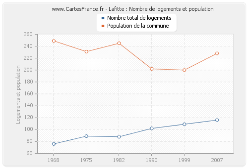 La population de Lafitte était de 228 habitants en 2007, 200 habitants en 1999, 202 habitants en 1990, 245 habitants en 1982, 231 habitants en 1975 et 249 habitants en 1968. Parallèlement, le nombre de logements de Lafitte était de 116 en 2007, 109 en 1999, 102 en 1990, 88 en 1982, 89 en 1975 et 76 en 1968.