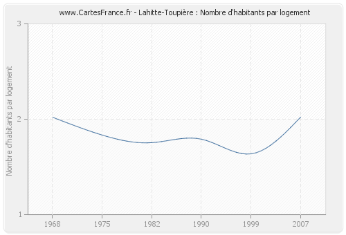 - Nombre d'habitants moyen par logement de Lahitte-Toupière en 2007 : 2,02