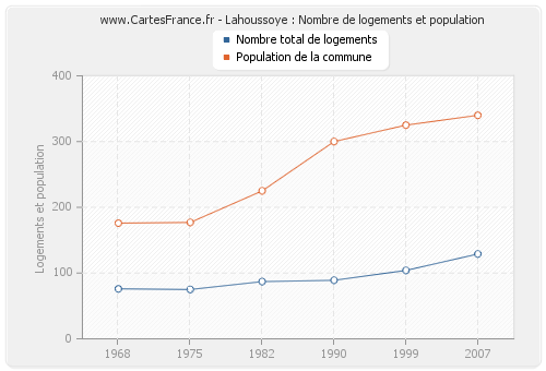 La population de Lahoussoye était de 340 habitants en 2007, 325 habitants en 1999, 300 habitants en 1990, 225 habitants en 1982, 177 habitants en 1975 et 176 habitants en 1968. Parallèlement, le nombre de logements de Lahoussoye était de 129 en 2007, 104 en 1999, 89 en 1990, 87 en 1982, 75 en 1975 et 76 en 1968.