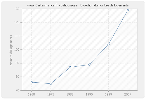 Le nombre de logements de Lahoussoye était de 129 en 2007, 104 en 1999, 89 en 1990, 87 en 1982, 75 en 1975 et 76 en 1968.
