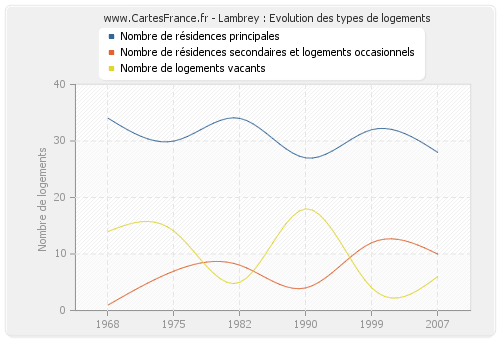 Les graphiques suivant reprennent l'historique du nombre et du type de logements de Lambrey de 1968 à 2007. Le deuxième graphique est tracé en interpolation cubique. Ceci permet d'obtenir plus précisément le nombre de logement du village de Lambrey les années ou aucun recensement n'a été effectué.