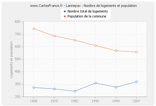La population de Lannepax était de 558 habitants en 2007, 568 habitants en 1999, 610 habitants en 1990, 652 habitants en 1982, 686 habitants en 1975 et 744 habitants en 1968. Parallèlement, le nombre de logements de Lannepax était de 320 en 2007, 277 en 1999, 310 en 1990, 245 en 1982, 263 en 1975 et 274 en 1968.