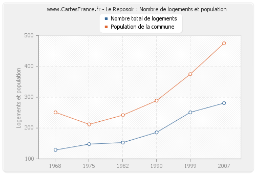La population de Le Reposoir était de 475 habitants en 2007, 375 habitants en 1999, 289 habitants en 1990, 242 habitants en 1982, 212 habitants en 1975 et 251 habitants en 1968. Parallèlement, le nombre de logements de Le Reposoir était de 281 en 2007, 251 en 1999, 186 en 1990, 153 en 1982, 148 en 1975 et 129 en 1968.
