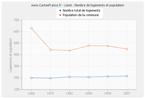 La population de Lemé était de 450 habitants en 2007, 476 habitants en 1999, 478 habitants en 1990, 436 habitants en 1982, 444 habitants en 1975 et 629 habitants en 1968. Parallèlement, le nombre de logements de Lemé était de 216 en 2007, 213 en 1999, 208 en 1990, 210 en 1982, 198 en 1975 et 201 en 1968.