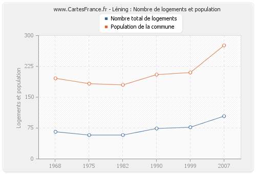 La population de Léning était de 276 habitants en 2007, 210 habitants en 1999, 205 habitants en 1990, 180 habitants en 1982, 183 habitants en 1975 et 196 habitants en 1968. Parallèlement, le nombre de logements de Léning était de 104 en 2007, 77 en 1999, 74 en 1990, 58 en 1982, 58 en 1975 et 66 en 1968.