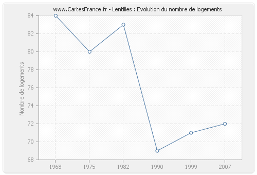 Le nombre de logements de Lentilles était de 72 en 2007, 71 en 1999, 69 en 1990, 83 en 1982, 80 en 1975 et 84 en 1968.