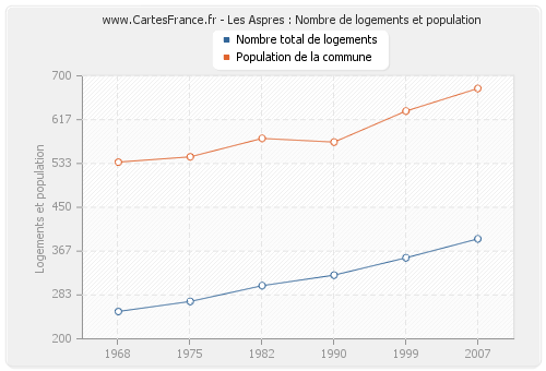La population de Les Aspres était de 676 habitants en 2007, 633 habitants en 1999, 574 habitants en 1990, 581 habitants en 1982, 546 habitants en 1975 et 536 habitants en 1968. Parallèlement, le nombre de logements de Les Aspres était de 390 en 2007, 354 en 1999, 321 en 1990, 301 en 1982, 271 en 1975 et 252 en 1968.