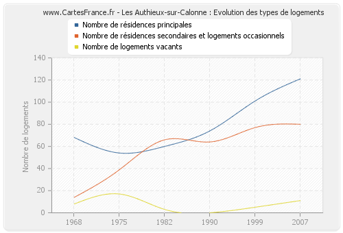 Les graphiques suivant reprennent l'historique du nombre et du type de logements de Les Authieux-sur-Calonne de 1968 à 2007. Le deuxième graphique est tracé en interpolation cubique. Ceci permet d'obtenir plus précisément le nombre de logement du village de Les Authieux-sur-Calonne les années ou aucun recensement n'a été effectué.