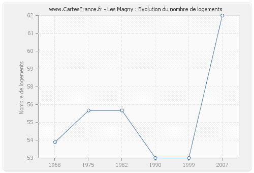 Le nombre de logements de Les Magny était de 62 en 2007, 53 en 1999, 53 en 1990, 56 en 1982, 56 en 1975 et 54 en 1968.