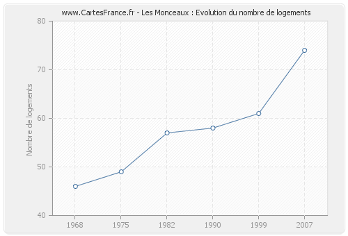 Le nombre de logements de Les Monceaux était de 74 en 2007, 61 en 1999, 58 en 1990, 57 en 1982, 49 en 1975 et 46 en 1968.