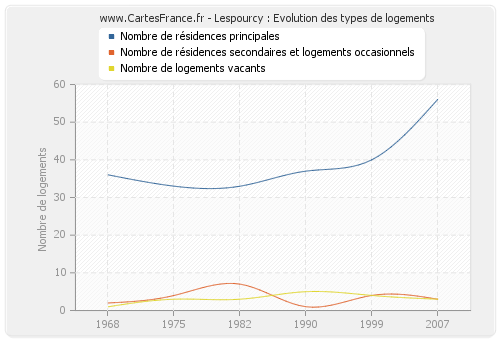 En 2007 les logements de Lespourcy étaient composés de 56 résidences principales, 3 résidences secondaires ou occasionnels ainsi que 3 logements vacants.