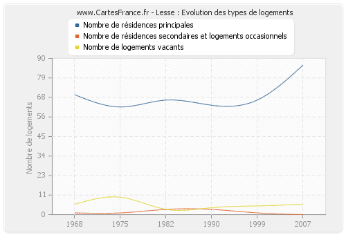 En 2007 les logements de Lesse étaient composés de 86 résidences principales, 0 résidences secondaires ou occasionnels ainsi que 6 logements vacants.