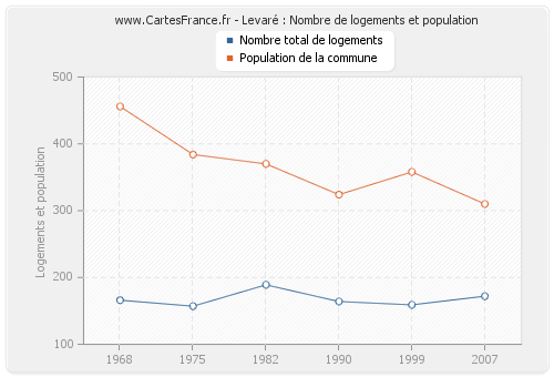 La population de Levaré était de 310 habitants en 2007, 358 habitants en 1999, 324 habitants en 1990, 370 habitants en 1982, 384 habitants en 1975 et 456 habitants en 1968. Parallèlement, le nombre de logements de Levaré était de 172 en 2007, 159 en 1999, 164 en 1990, 189 en 1982, 157 en 1975 et 166 en 1968.