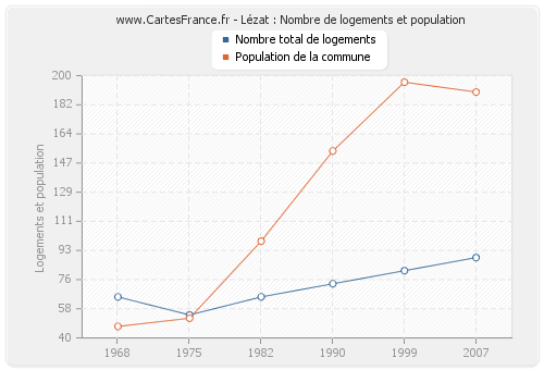 La population de Lézat était de 190 habitants en 2007, 196 habitants en 1999, 154 habitants en 1990, 99 habitants en 1982, 52 habitants en 1975 et 47 habitants en 1968. Parallèlement, le nombre de logements de Lézat était de 89 en 2007, 81 en 1999, 73 en 1990, 65 en 1982, 54 en 1975 et 65 en 1968.