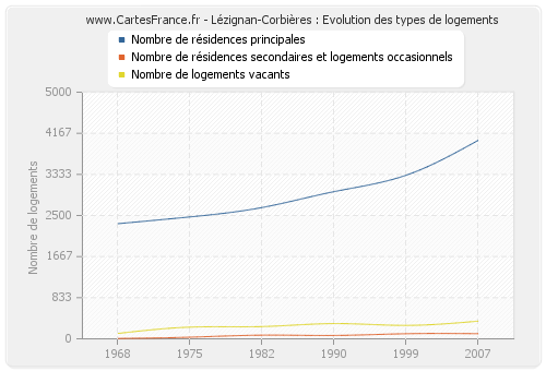 Le nombre de logements de Lézignan-Corbières était de 4 482 en 2007, 3 690 en 1999, 3 361 en 1990, 2 984 en 1982, 2 742 en 1975 et 2 452 en 1968.