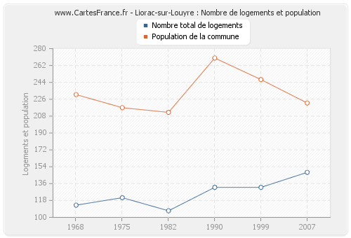 La population de Liorac-sur-Louyre était de 222 habitants en 2007, 247 habitants en 1999, 270 habitants en 1990, 212 habitants en 1982, 217 habitants en 1975 et 231 habitants en 1968. Parallèlement, le nombre de logements de Liorac-sur-Louyre était de 148 en 2007, 132 en 1999, 132 en 1990, 107 en 1982, 121 en 1975 et 113 en 1968.