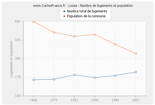 La population de Losse était de 271 habitants en 2007, 308 habitants en 1999, 347 habitants en 1990, 340 habitants en 1982, 356 habitants en 1975 et 399 habitants en 1968. Parallèlement, le nombre de logements de Losse était de 196 en 2007, 182 en 1999, 174 en 1990, 185 en 1982, 167 en 1975 et 165 en 1968.