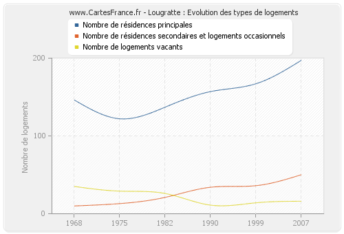 En 2007 les logements de Lougratte étaient composés de 197 résidences principales, 50 résidences secondaires ou occasionnels ainsi que 16 logements vacants.