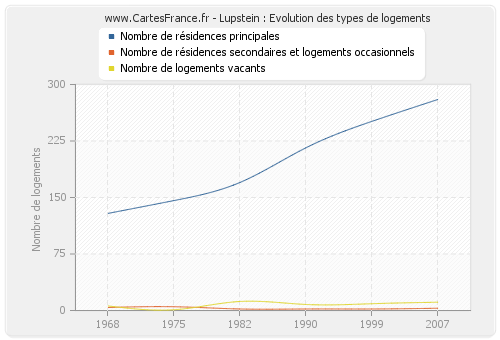 - Nombre de résidences principales de Lupstein en 2007 : 280