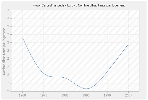- Nombre d'habitants moyen par logement de Lurcy en 2007 : 2,59
