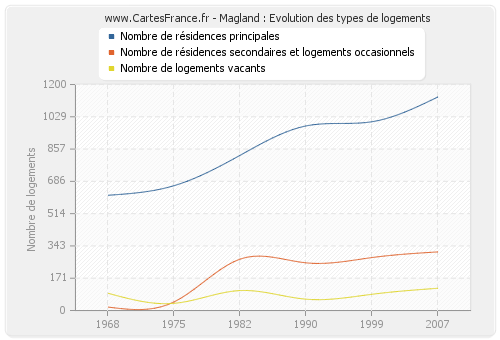 Les graphiques suivant reprennent l'historique du nombre et du type de logements de Magland de 1968 à 2007. Le deuxième graphique est tracé en interpolation cubique. Ceci permet d'obtenir plus précisément le nombre de logement de la ville de Magland les années ou aucun recensement n'a été effectué.